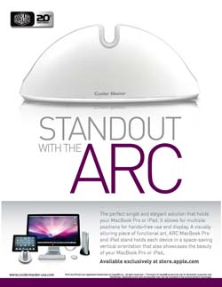 April 2012 Standout with the ARC The perfect single and elegant solution that holds your MacBook Pro or iPad. It allows for multiple positions for hands-free use and display. A visually alluring piece of functional art, ARC MacBook Pro and iPad stand holds each device in a space-saving vertical orientation that also showcases the beauty of your MacBook Pro or iPad. |