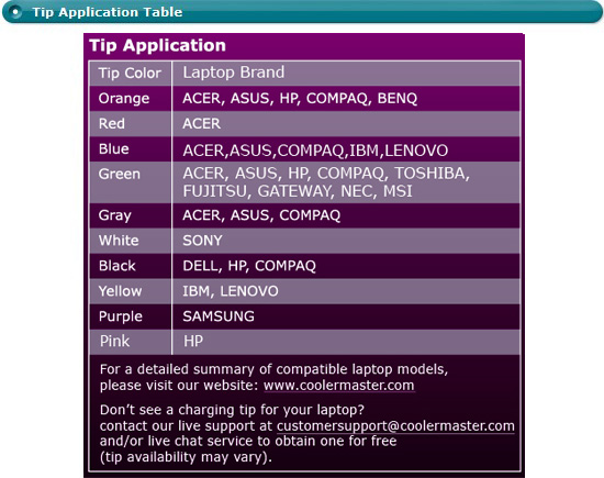 "Cooler Master NA 120 Notebook Power Adapter is a 120W power adapter that will work with most notebooks. It's comes with many power tips which are easy to install and makes connection(s) fast and simple. If you need to replace your notebook power adapter or maybe you need a spare one, this would do the job."