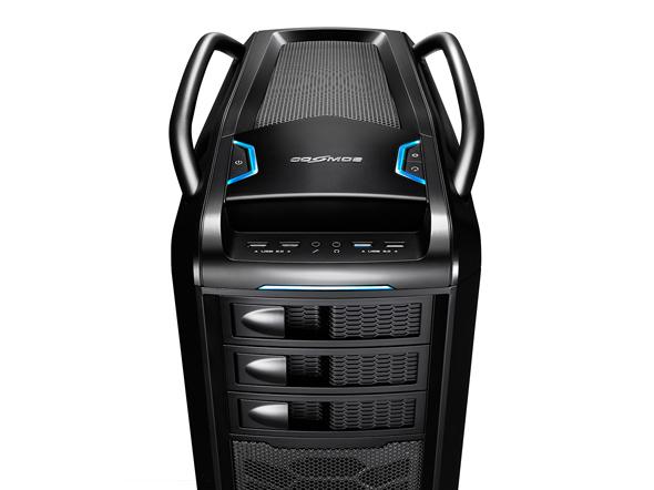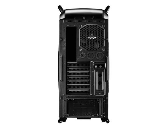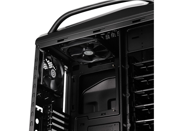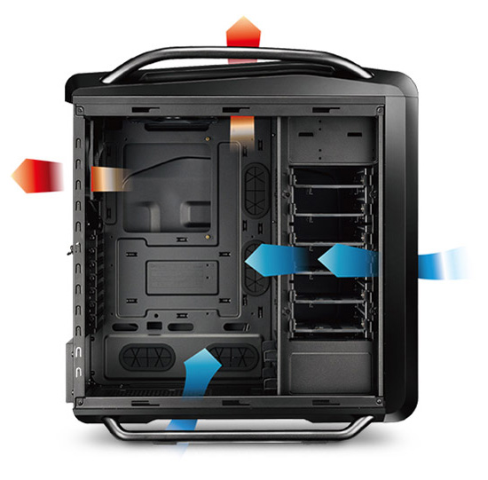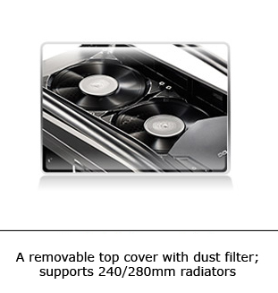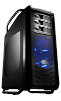 | Cooling System | Top: 120/140mm fan x 2 (one 140mm black fan installed, 1200 RPM, 19 dBA) Front: 120mm blue LED fan x 2 (installed; with LED on/off), or 140mm fan x 1 (optional) Rear: 120mm fan x 1 (installed, 1200 RPM, 17 dBA) HDD cage: 120mm fan x 2 (optional) |