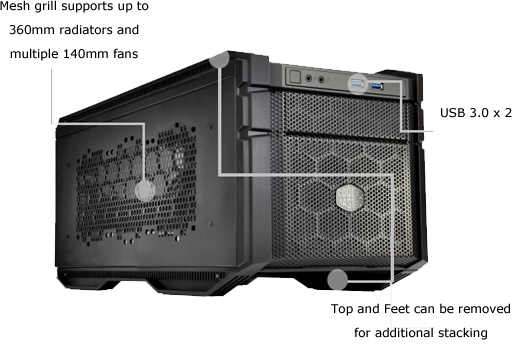 | Cooling System | (varies by stacking setup) Rear: 120mm x 1 (included) Side: 6 x 120mm or 4 x 140mm Radiators: 360mm x 2 / 280mm x 2 (Side) / 120mm (Rear) |
