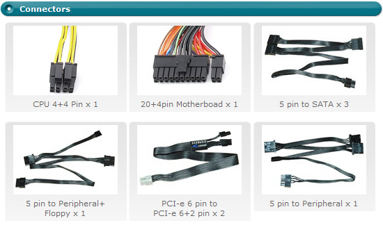 | Connector | M/B 20+4 Pin Connector x 1 CPU 4+4 Pin x 1 PCI-E 6+2 Pin x 2 4 Pin Peripheral x 5 SATA x 9 4 Pin Floppy x 1 |