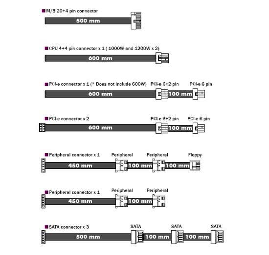 | Connector | M/B 20 + 4 pins x 1 CPU 4 + 4 pins x 1 PCI-e 6+2 pins x 3 / PCI-e 6 pins x 3 (One PCI-e 6+2 pins connector extends to one PCI-e 6 pins connector) SATA x 9 / Peripheral 4 pins x 4 Floppy 4 pins x 1 |