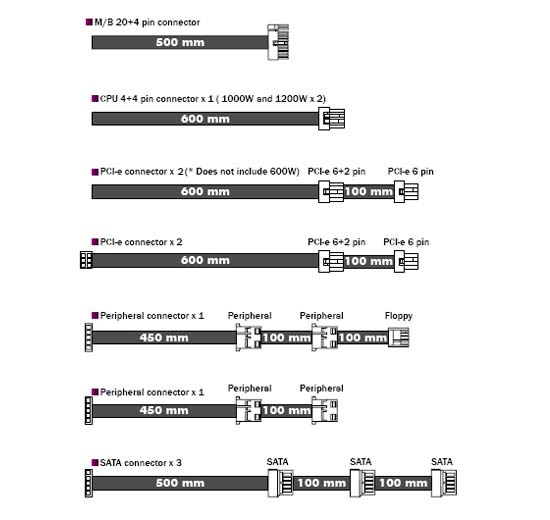 | Connector | M/B 20 + 4 pins x 1 CPU 4 + 4 pins x 2 PCI-e 6+2 pins x 4 / PCI-e 6 pins x 4 (One PCI-e 6+2 pins connector extends to one PCI-e 6 pins connector) SATA x 9 / Peripherial 4 pins x 4 Floppy 4 pins x 1 |