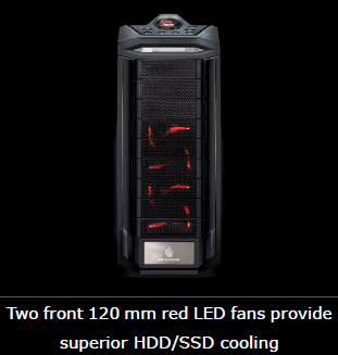 | Cooling System | Front: 120 mm LED fan x2 (1200 RPM, 17dBA) Top: 200 mm fan x 1 (1000 RPM, 23 dBA) Rear: 140 mm fan x1 (1200 RPM, 19 dBA) (converted to 120 mm fan) Bottom: 120 mm fan x 2 (optional) Side: 120 mm fan x 2 (optional) How to wire fans |