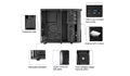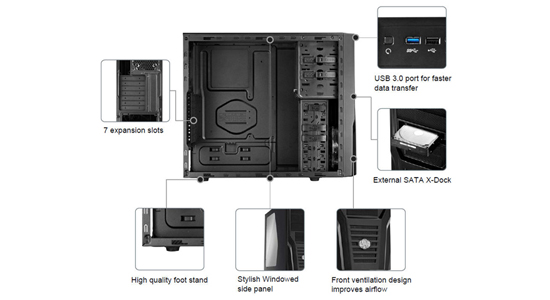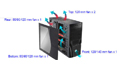 | Cooling System | Front: 120mm Blue LED fan x 1, 140mm (optional) Top: 120mm fan x 2 (optional) Rear: 80/90/120 mm fan x 1 (optional) Bottom: 80/90/120mm fan x 1 (optional) |